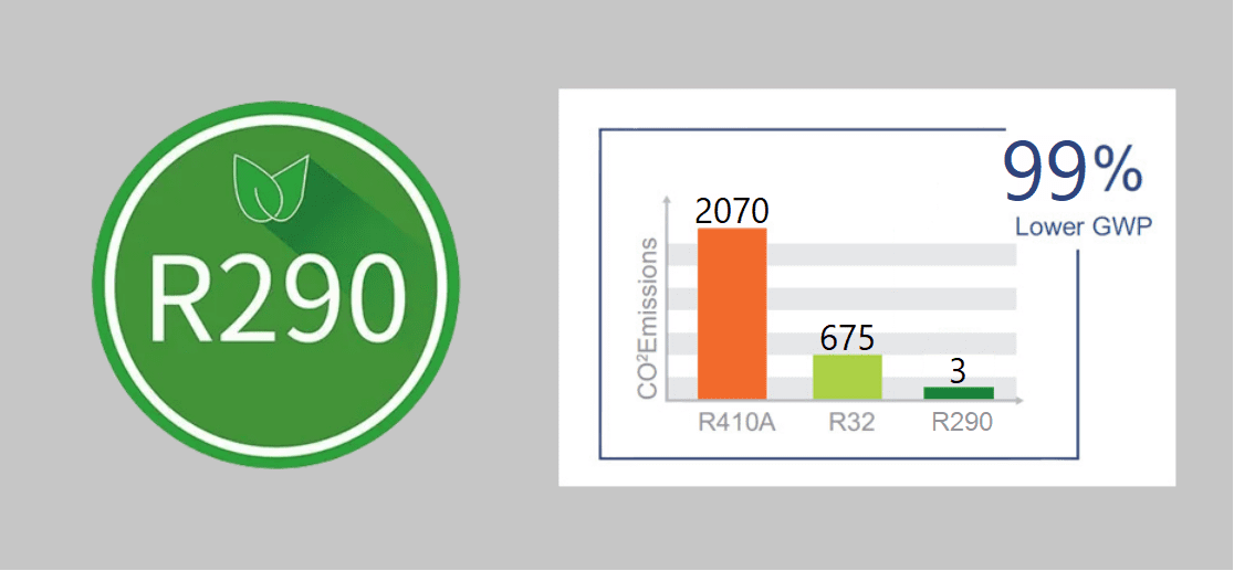 R290 refrigerant offers excellent energy efficiency, with a 34% performance improvement over R32. It delivers superior cooling and heating while consuming less energy, allowing systems to achieve A+++ COP ratings, the highest energy efficiency level. This makes R290 a sustainable choice for reducing energy consumption, minimizing environmental impact, and supporting carbon neutrality goals.