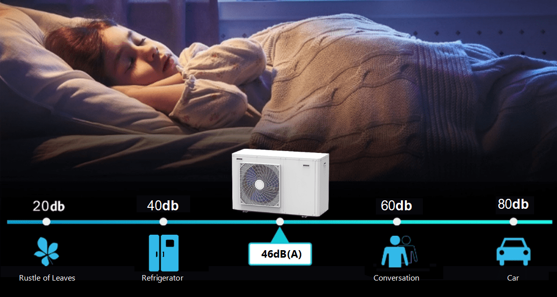Our heat pump utilizes R32 refrigerant, offering both environmental efficiency and exceptional user experience. Its low-noise system is meticulously engineered, operating at a minimal noise level of just 46 decibels, akin to the tranquility of a library. This ensures a peaceful and comfortable living environment, free from noise disturbances.